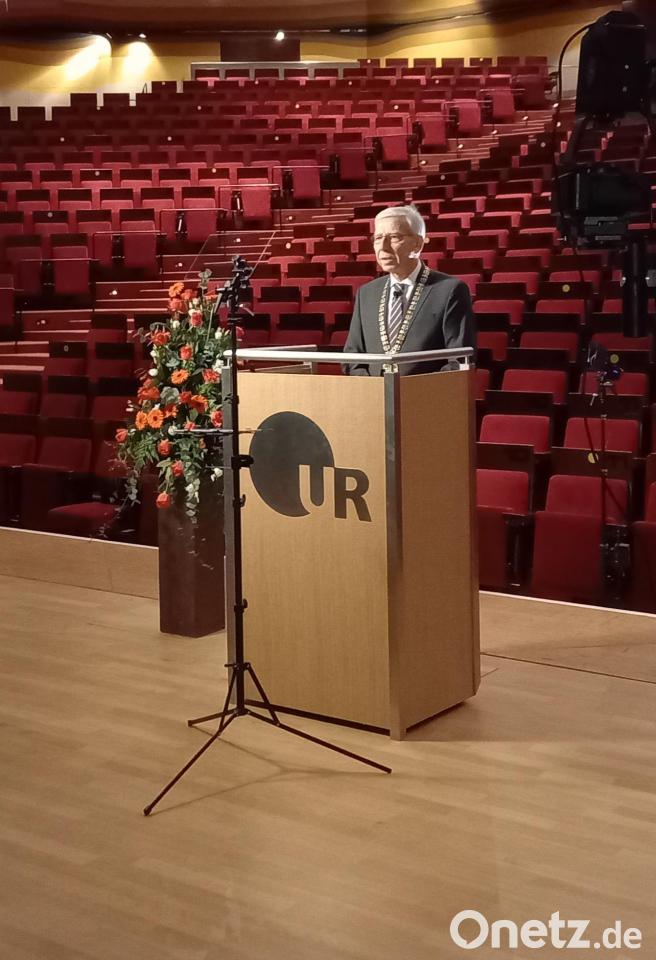Alljährlich feiert die Hochschulfamilie der Universität Regensburg im November ihren Dies academicus. Zum zweiten Mal in Folge musste die Veranstaltung wegen der Corona-Lage als Online-Format stattfinden. Präsident Professor Udo Hebel begrüßte die Gäste am Donnerstagabend in einem Livestream aus dem menschenleeren Audimax der Universität. Er blickte zurück auf eineinhalb Jahre, in denen Corona auf dem Campus vieles verändert hat. Die Umstellung auf digitale Lehre zu Beginn der Pandemie verglich Hebel mit einem Sprung ins kalte Wasser.