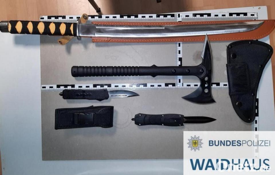 Die Bundespolizei hat einem 21-Jährigen an der tschechischen Grenze eine offenbar gerade erst gekaufte Kollektion von Machete, Wurfaxt und Springmessern abgenommen. Zivilfahnder stoppten am Dienstagabend am Grenzübergang Waidhaus das Auto, in dem der Mann mitfuhr. Die Machete fand sich im Kofferraum, im Rucksack die Wurfaxt. Zuletzt zog der 21-Jährige auf die Frage nach weiteren Waffen noch zwei Springmesser „aus der Unterhose“, wie die örtliche Bundespolizeiinspektion am Mittwoch mitteilte. Der Mann hatte die in Deutschland verbotenen Hieb- und Stichwaffen demnach auf der tschechischen Seite der Grenze in der Ortschaft Rozvadow (Roßhaupt) gekauft. Gegen ihn wird nun wegen Verstößen gegen das Waffengesetz ermittelt.