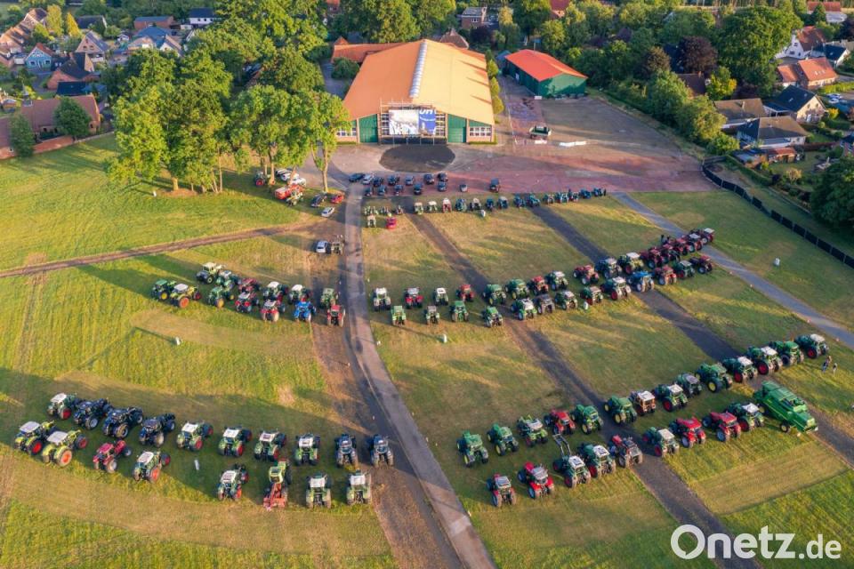 Für einen Film über eine preisgekrönte Kuh aus Niedersachsen sind am Sonntagabend rund 150 Traktoren zum Autokino Wüsting nach Hude im Landkreis Oldenburg gekommen.