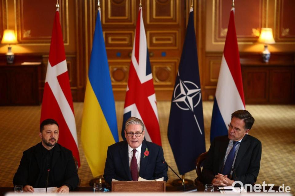 Die EU-Staaten hätten diesbezüglich „einen sehr wichtigen Schritt nach vorne gemacht“, lobte Starmer bei einer gemeinsamen Pressekonferenz mit Selenskyj, Nato-Generalsekretär Mark Rutte, Dänemarks Ministerpräsidentin Mette Frederiksen und dem niederländischen Regierungschef Dick Schoof. Diese Fortschritte müssten nun „innerhalb eines kurzen Zeitrahmens Früchte tragen“, sagte er.