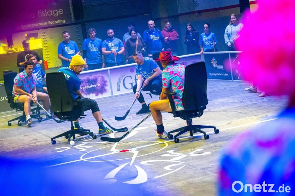 Rund 500 Sportlerinnen und Sportler rollen durch die Halle. „Das ist schon der Wahnsinn“, sagte Initiator Jens Fislage. Angefangen habe alles mit einem „kleinen Gag“: Der Inhaber eines Büromöbelhandels aus Ritterhude (Landkreis Osterholz) wollte seine Firmenfeier mit einem Hockey-Turnier mit Bürostühlen auflockern. Die eigene Lagerhalle wurde schnell zu klein, inzwischen treten Mannschaften aus ganz Deutschland gegeneinander an.