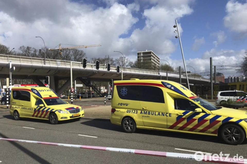 Krankenwagen stehen neben einer Straßenbahn in Utrecht. Foto: Peter Dejong/AP