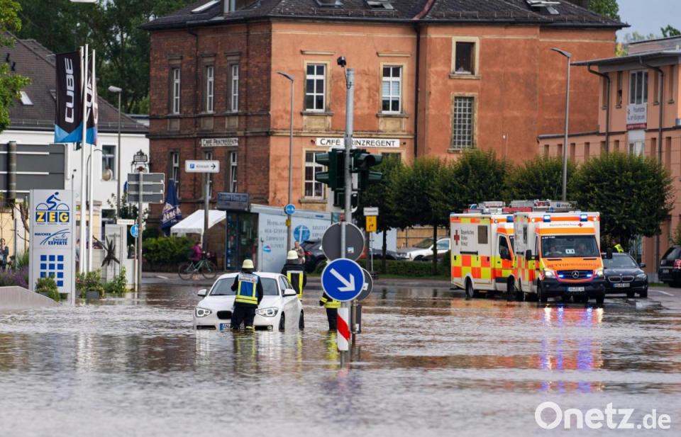 Neustadt an der Aisch/Hof. Stundenlanger Dauerregen hat am Freitag in Teilen Frankens Wiesen, Straßen und teils ganze Landstriche unter Wasser gesetzt. Kanalisation, Flüsse und Bäche waren stellenweise überfordert und konnten die Wassermassen nicht mehr aufnehmen. Im Landkreis Neustadt an der Aisch-Bad Windsheim und in der Stadt Ansbach wurde der Katastrophenfall ausgerufen. In Ansbach hatte zusätzlich der Fund einer Fliegerbombe aus dem Zweiten Weltkrieg Einsatzkräfte gebunden. Nachdem 2360 Menschen ihre Wohnungen verlassen hatten, konnte die Bombe erfolgreich entschärft werden, sagte ein Sprecher der Stadt am Abend.