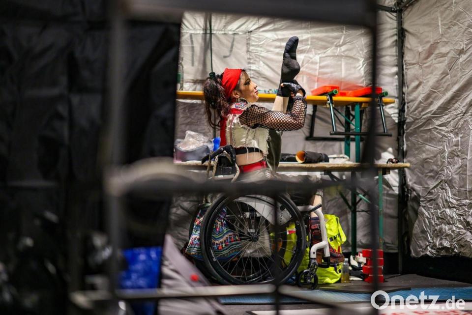 Neben den vielen jungen und unversehrten Körpern, die unter der Kuppel des schwarzen Zirkuszeltes durch die Luft wirbeln, ist Pans Darbietung ein fast schon stiller, aber nicht minder atemraubender Kontrast: Im Rollstuhl fährt die 52-Jährige auf die Bühne, wird von ihrem Mann auf ein Podest gehoben, fixiert ihre Füße an einer Stange - und lässt Sekunden später vergessen, dass sie ihren Unterkörper nicht kontrollieren kann.