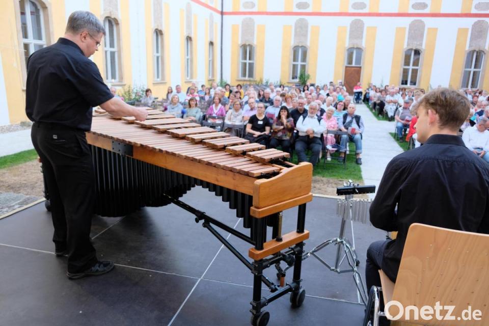 Entschädigt werden die Besucher durch musikalische Darbietungen auf dem Marimbafon, einem ursprünglich afrikanischen Instrument, und mit der Percussion. Das Publikum lauscht den Solostücken von Klaus Rosner und Leon Neudert. Mit „Ghana“, „Nancy“ und „Les Violons Morts“ gelingen den Solisten hinreißende Kabinettstücke. Der einzigartig warme und zugleich runde Klang dieser Instrumente verleiht den Schlussakkorden des Abendkonzerts mit „Circles of Ice“ und dem „Festival Song“ von Eckhard Kopetzki unvergleichlich meditative Momente. Sanft und zärtlich auch die Zugabe. Schöner hätte man gar nicht „Gute Nacht“ und „Auf Wiedersehen im nächsten Festspielsommer“ sagen können.