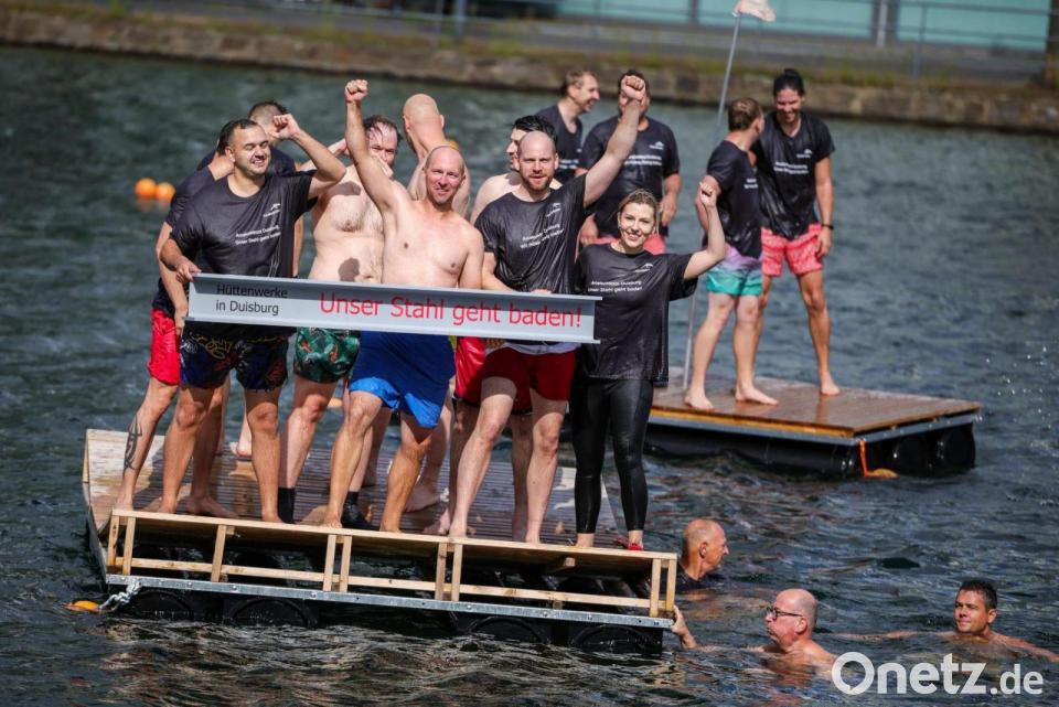 Mit einer spektakulären Aktion im Duisburger Innenhafen haben Beschäftigte des Stahlkonzerns Arcelormittal für den Erhalt ihrer Arbeitsplätze demonstriert und Investitionen in den Duisburger Standort gefordert. Unter dem Motto „Unser Stahl geht baden“ sprangen rund 60 Stahlarbeiter von der Kaimauer ins Hafenbecken. An einer parallelen Kundgebung nahmen nach Angaben der IG Metall mehr als 550 Beschäftigte teil, darunter auch Mitarbeiter der Stahlunternehmen HKM und Thyssenkrupp Steel. Arcelormittal stellt in Duisburg unter anderem Draht für die Autoindustrie und den Maschinenbau her und beschäftigt laut IG Metall rund 850 Menschen.