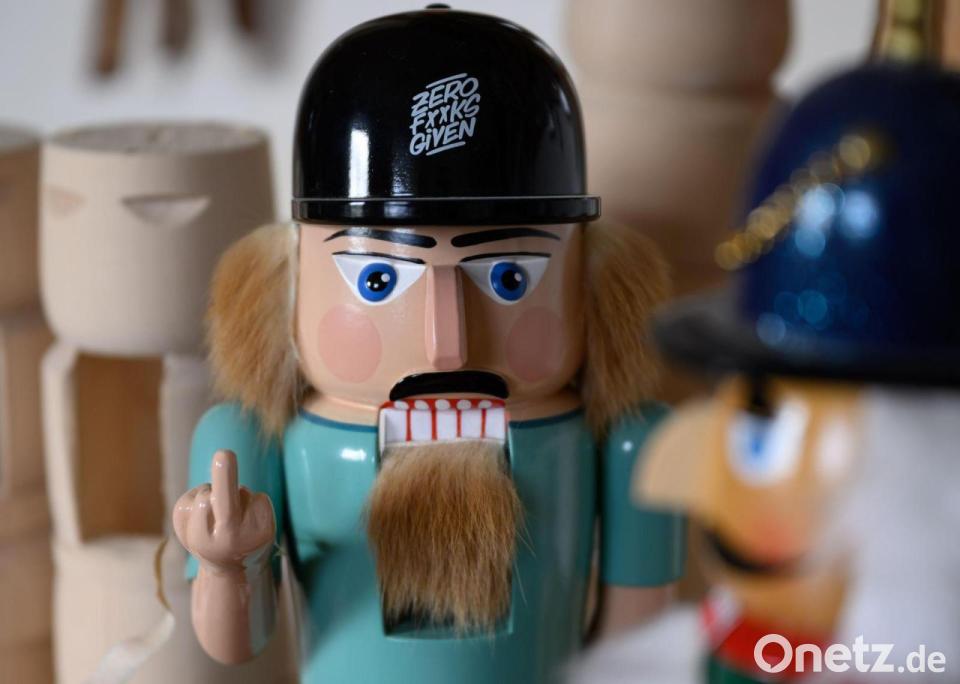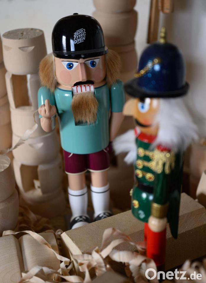 Auf den erzgebirgischen Nussknacker lässt Füchtner nichts kommen, gilt doch sein Ur-Ur-Ur-Großvater als dessen Erfinder. Also hat er an der Drechselbank das gemacht, was er besonders gut kann: einen neuen Nussknacker. Der ist zwar wie seine Kollegen aus Holz und hat Bart und Haar aus Kaninchenfell. Statt rotem Gewand trägt er jedoch kurze Hosen und Basecap. Und die Hand zeigt eine eindeutige Geste. Der hölzerne Rebell sei in Zusammenarbeit mit „Boys from the Wood“ entstanden - einer Gruppe junger Leute, die das Erzgebirge und sein Brauchtum auf moderne Art und Weise feiern, betont der 44-Jährige.