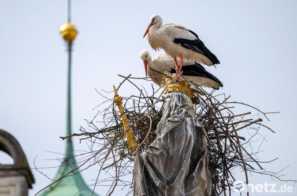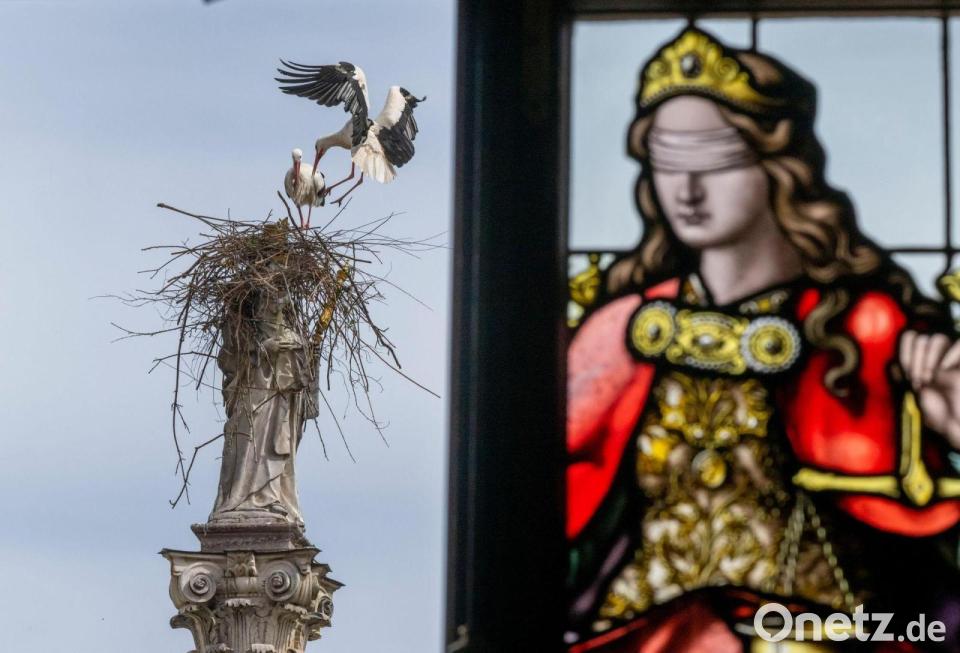 Denn die Mariensäule ist eigentlich von ihrer Oberfläche her viel zu klein für ein Storchennest. „Die aktuellen Bauversuche der Störche gelten als wenig erfolgversprechend“, teilte die Stadt mit. Sie hätten jetzt schon Schaden angerichtet: „Erste kleinere Schäden, etwa an der Krone der Mariensäule, wurden bereits festgestellt.“