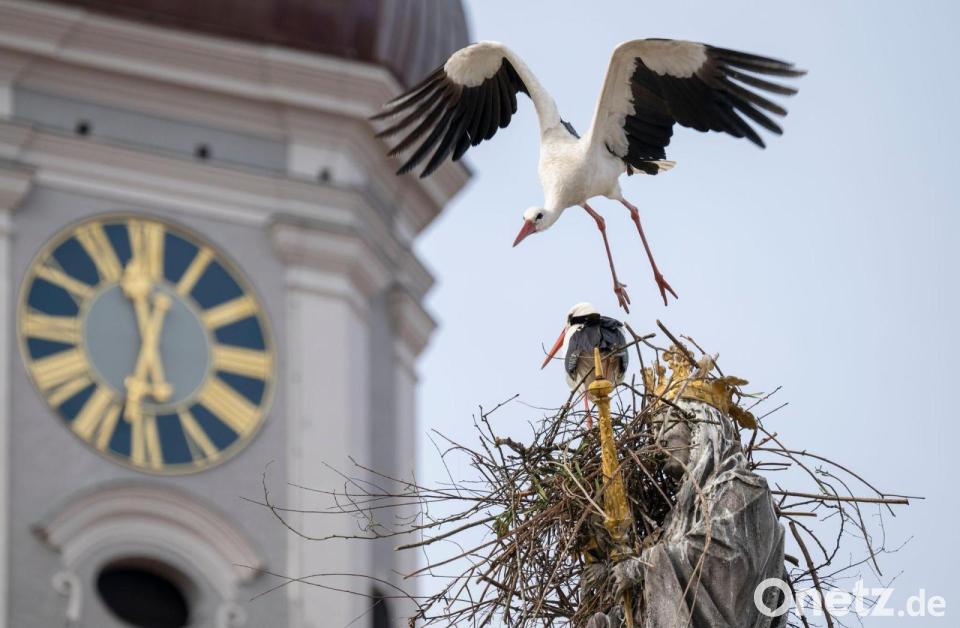 Die Stadt Freising hat ein Problem: Ein Storchenpaar hat sich ausgerechnet die Mariensäule vor dem Rathaus, eines der bekanntesten Denkmäler der Stadt, als Nistplatz ausgesucht. Hartnäckig versuchen die Vögel dort seit einiger Zeit, auf dem gekrönten Haupt der Gottesmutter ihr Nest zu bauen.