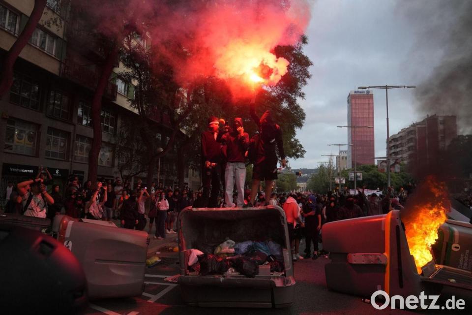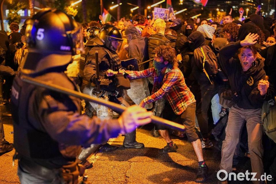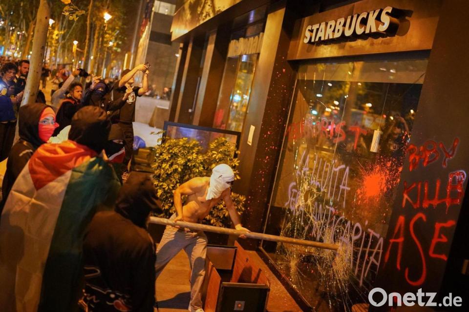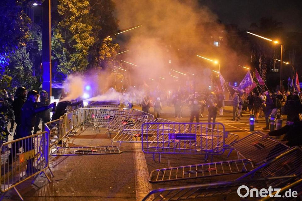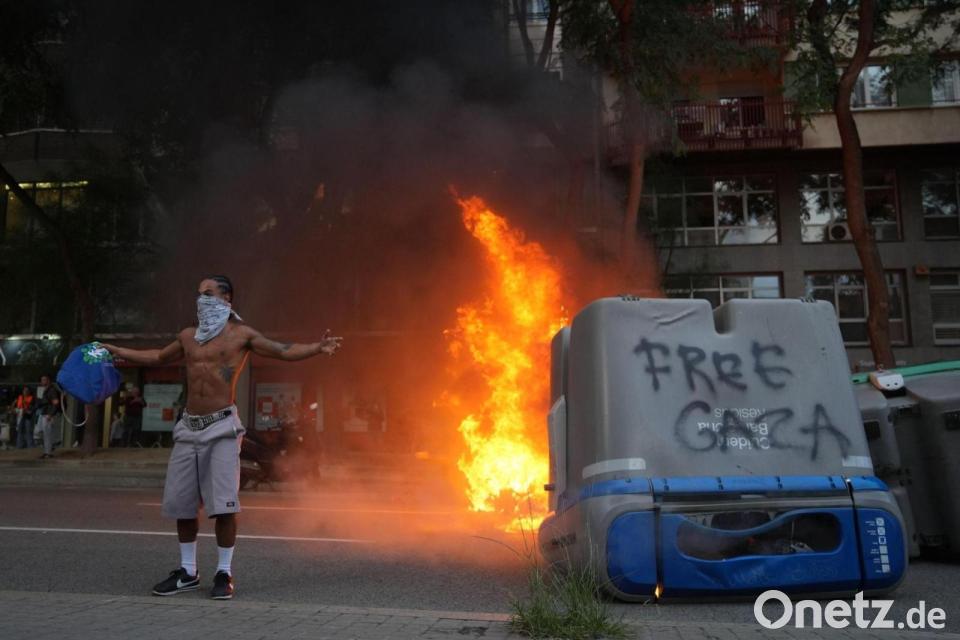 Im Fernsehen war zu sehen, wie Vermummte große Müllcontainer aus Plastik in Brand setzten und Fensterscheiben eines Cafés und eines Schnellimbisses einschlugen. Schon zuvor war es am Bahnhof Sants zu Auseinandersetzungen mit der Polizei gekommen. Demonstranten hätten dort versucht, die Basketballmannschaft von Hapolel Jerusalem am Verlassen des Bahnhofs zu hindern, berichtete der staatliche TV-Sender RTVE. Die Israelis sollten ein Spiel ohne Publikum gegen den lokalen Verein Baxi Manresa bestreiten. Die Polizei setzte Pfefferspray ein, Demonstranten warfen Flaschen und andere Gegenstände.