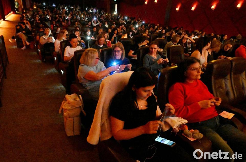 Auf der Kinoleinwand kochen die Emotionen hoch, unten im Saal klappern leise die Stricknadeln. Sämtliche 260 Plätze sind belegt. Frauen allen Alters sind gekommen, dazwischen eine Handvoll Männer. Kleine Leselampen leuchten auf, auch die ein oder andere Stirnlampe. Während Hugh Jackman für Drama und Herzschmerz in „The Greatest Showman“ sorgt, lassen Hunderte flinke Hände Socken, Schals oder Pullover anwachsen – Masche für Masche, Reihe für Reihe.