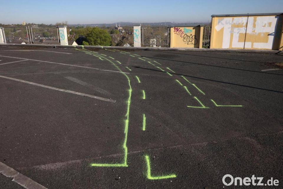 Die Polizei hat mit Farbe Spuren auf dem obersten Parkdeck nachgezogen, sie führen in einem Bogen direkt an den Abgrund: Zwei junge Männer sind gestern in Essen gegen 19.20 Uhr mit einem Auto aus der obersten Etage des Parkhauses im Stadtteil Borbeck gestürzt und ums Leben gekommen.
