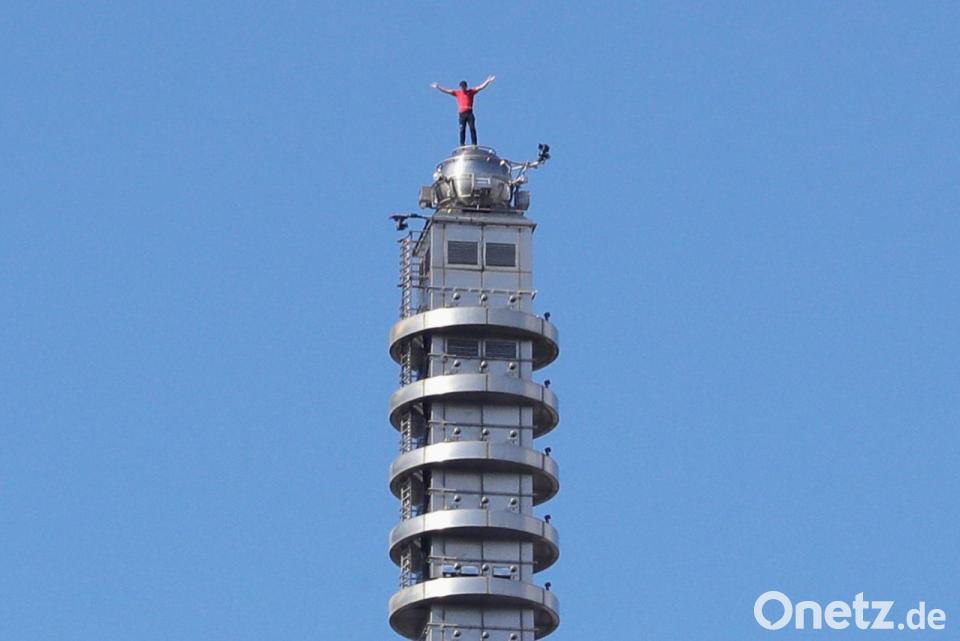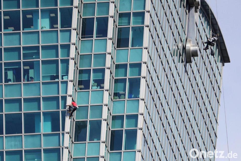Auf der 60. Etage waren sie sich bereits begegnet - sie drinnen mit dem Daumen nach oben, er außen an der Fassade. Auch sonst verfolgten Schaulustige den Aufstieg hinter den Glasfassaden der Bürofenster. Nicht wenige hielten die Momente mit dem Smartphone fest, andere bunte Plakate mit Durchhalteparolen hoch.