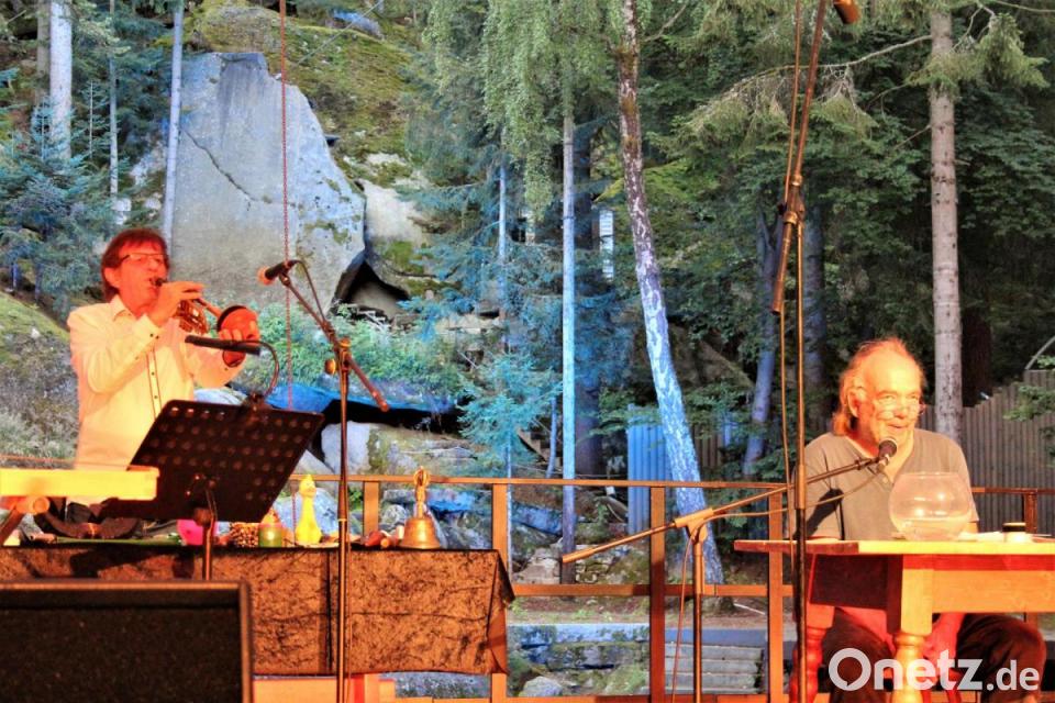 Abstands- und Hygieneregeln machen es nötig, dass die Reihe vom Innenhof des Fichtelgebirgsmuseums auf die Luisenburg verlegt wird: Die Bühne ist im Block B des Zuschauerraums aufgebaut, die Besucher nehmen ihre Plätze im oberen Drittel unter dem Zeltdach ein. Plätze – das sind in diesem Fall die Stufen ohne Stühle, dafür mit mitgebrachten Kissen und Decken. Alles recht ungewöhnlich, aber dennoch mit einem gewissen Charme gerade in einer recht kulturfreien Zeit.