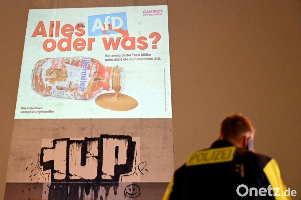In Berlin war etwa eine entsprechende Projektion in der Nähe des Alexanderplatzes zu sehen. Auf den Motiven steht beispielsweise in Anlehnung an einen bekannten Müller-Werbeslogan „Alles AfD oder was?“. Darunter steht: „Konzerngründer Theo Müller unterstützt die rechtsextreme AfD.“ Wegen dieses Satzes verlangt der Berliner Rechtsanwalt Christian Schertz im Namen von Müller nun eine Unterlassungserklärung von Campact. Zunächst hatte die „Frankfurter Allgemeine Zeitung“ darüber berichtet.
