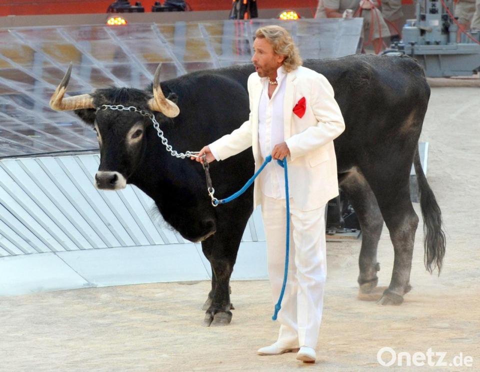 Eines der Highlights jedes „Wetten, dass..?“-Jahres: Die Sommershows auf Mallorca, in denen Gottschalk sich gerne besonders pompös in weiß gekleidet zeigte. Natürlich durfte in der Stierkampfarena auch ein Bulle nicht fehlen.