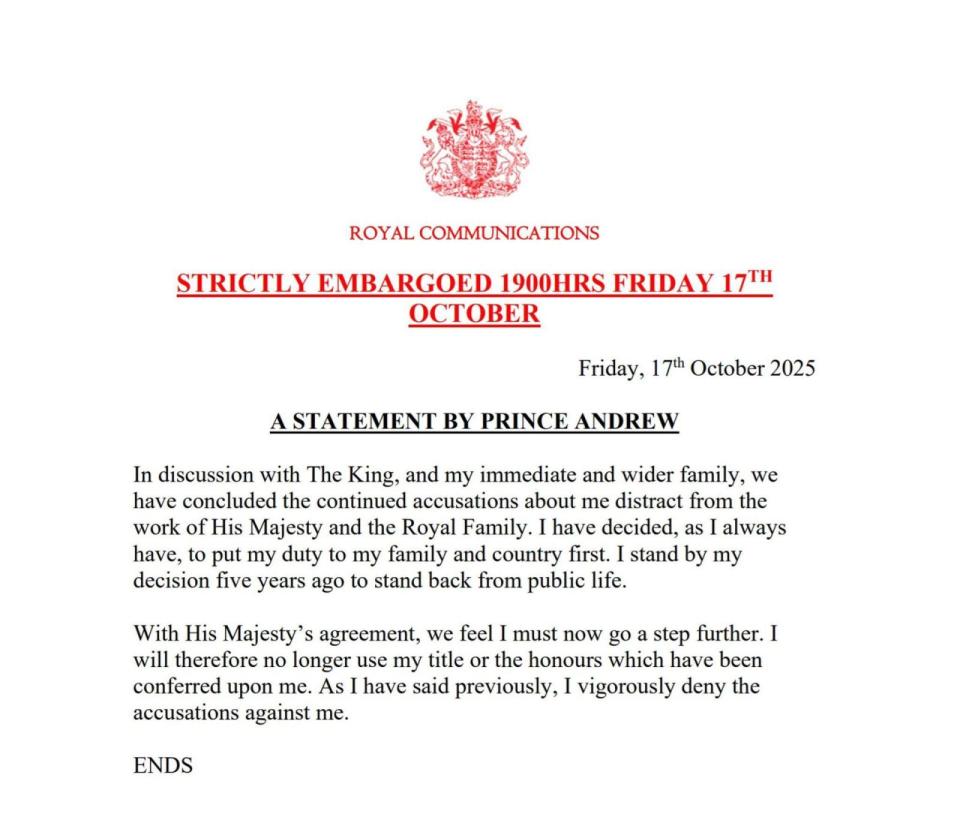 Nach neuen mutmaßlichen Beweisen für die wohl tiefe Freundschaft zwischen Andrew und Epstein und kurz vor der Veröffentlichung der Memoiren des bekanntesten Opfers hat der Prinz am Freitagabend seine verbliebenen Titel und Ehrungen aufgegeben. „Nach Diskussionen“ mit dem König und seiner Familie, steht in der offiziellen Mitteilung zwar. Der Tenor diverser britischer Medien ist aber klar: Andrew musste verzichten - sonst hätte der König den Schritt von oberster Stelle aus angeordnet.
