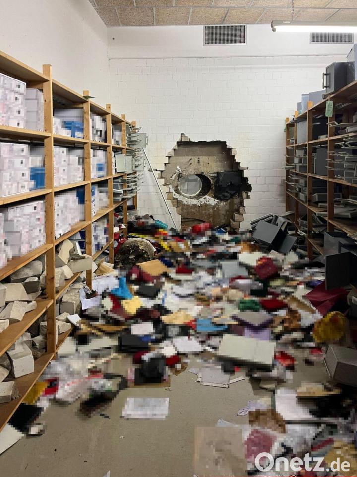 Auf einem von der Polizei veröffentlichten Foto sind zahlreiche auf den Boden geworfene Akten in dem Archivraum zu sehen. An den Wänden rechts und links stehen Holzregale. In der Mitte an der Wand klafft das kreisrunde Loch zum Tresorraum in der Wand. Auch zahlreiche Ziegelsteine fehlen an der Stelle.