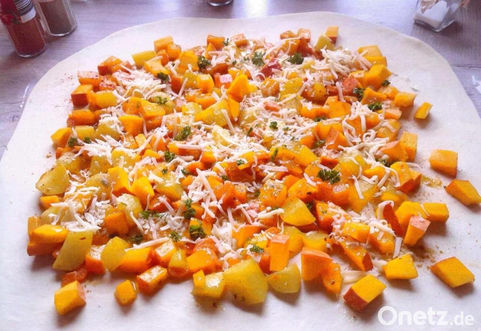 Den Kürbis und die Kartoffel in etwa 1 Zentimeter große Würfel schneiden. Den Feta-Käse zerbröseln. Mit allen weiteren Zutaten der Füllung verrühren und nach Belieben mit Muskat, Ingwer, Chili, Salz und Pfeffer abschmecken.