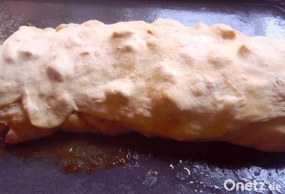 Den Teig auf einer Folie dünn ausziehen. Die Füllung darauf verteilen und alles zu einem Strudel aufrollen. Anschließend im auf 180 Grad Celsius Ober-/Unterhitze vorgeheizten Ofen 40 Minuten garen.
