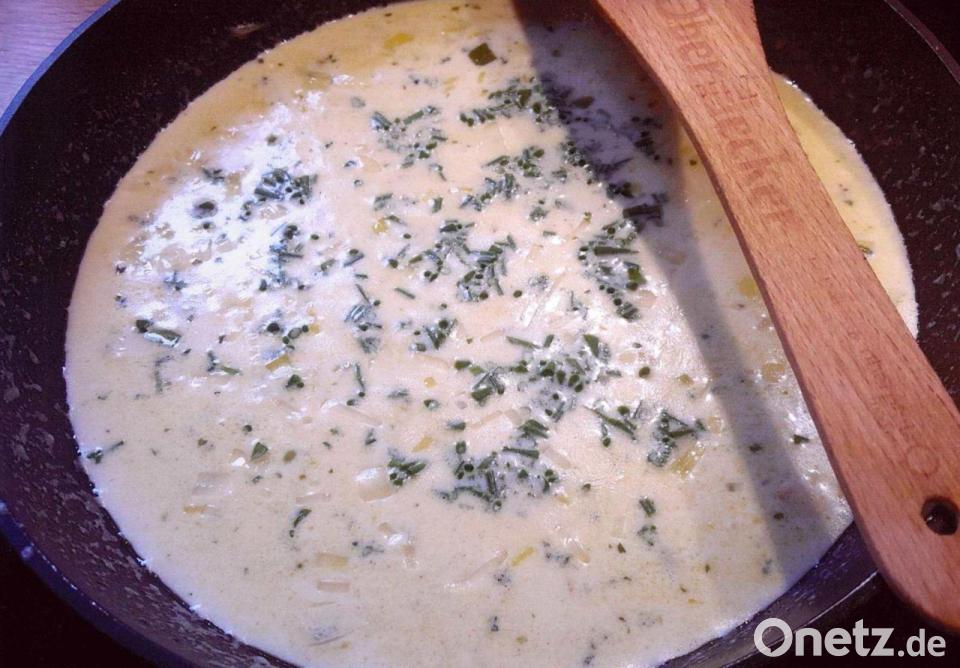 Die Sahne zugießen und auf die Hälfte reduzieren. Salzen, pfeffern, das Gemüsebrühe-Pulver dazugeben und die Schnittlauchröllchen einstreuen.