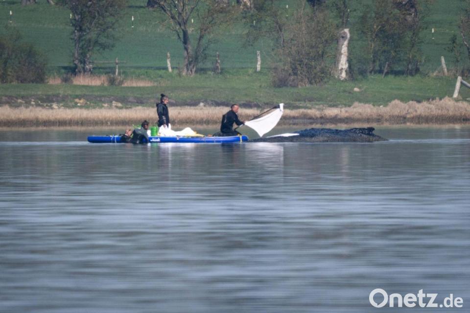 Am Vormittag waren auch Mitarbeiter des Umweltministeriums und des Landesamtes für Umwelt, Naturschutz und Geologie (LUNG) mit einem Polizeischlauchboot zum Wal hinausgefahren.