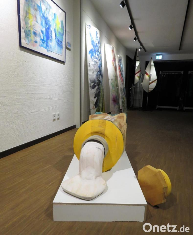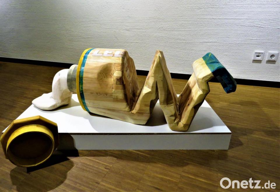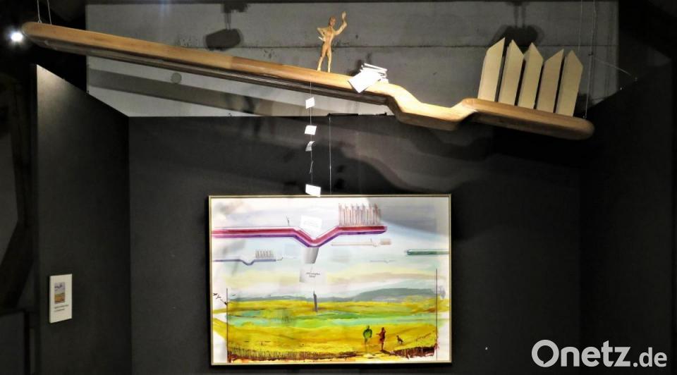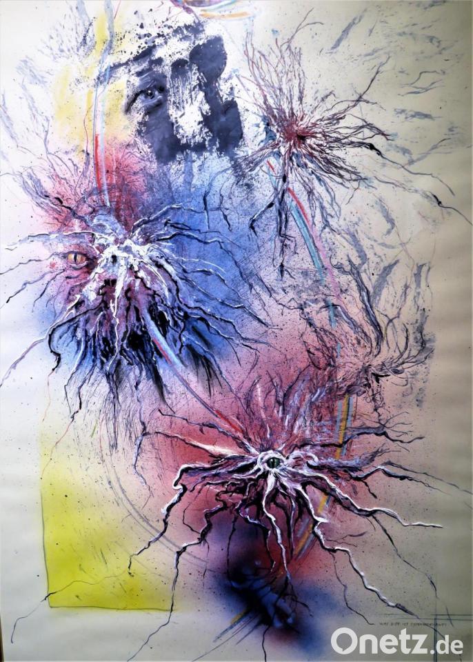 Ausführliche Textbegleitung zu den Kunstwerken legen offen, welch Geisteskind der Künstler in sich trägt. Großflächigen Malereien wie seinen Kalligrafien hat er komplizierte Titel gegeben. „Kalligrafie gegen läufiger Trends gegen starre Bürokratie“ heißt sein wohl bestes Werk. Bertram kann auch Text, ist ein Poet der kritischen Wortwahl. Die starre Bürokratie erklärt er zum Schubladendenken. Wo Bürokraten, mit Formularen etwas festnageln wollen, um die Kontrolle zu behalten. Die Gesichter auf seiner „Kalligrafie“ wirken entsetzlich gehetzt, verzerrt in ihrem Ausdruck. Als „Gesellschaftsmasken“ beschreibt sie Detlef Bertram. „Denn wer weiß schon, wer was ist?“ Dem Künstler aus Offenbach am Main, der Grenzen auch räumlich überschritten hat mit seinem Umzug in tschechische Hranice, fehlt es bei aller strengen Kritik an der Gesellschaft nicht an Witz. Aus der gequetschten Cremetube (geschnitzt aus Holz) quillt weiße Zahnpasta. Ein Werk, das dem Betrachter Freude macht. Der kindsgroße, hölzerne „Stinkefinger“ zeigt steil in den Himmel: Ihr könnt mich alle einmal! Will Detlef Bertram das damit sagen?