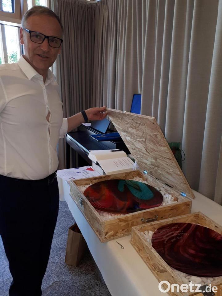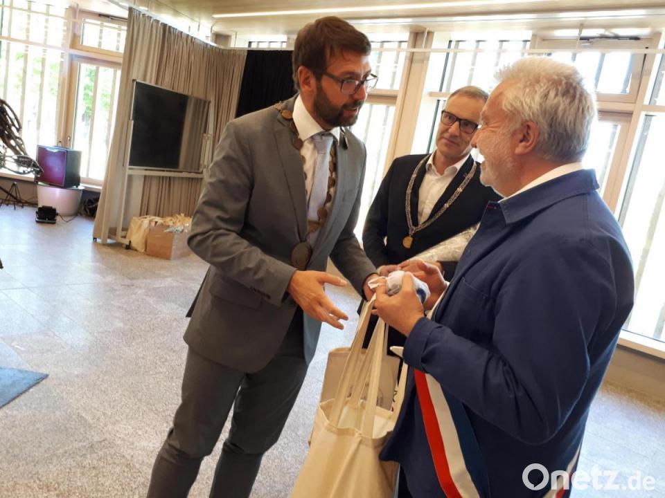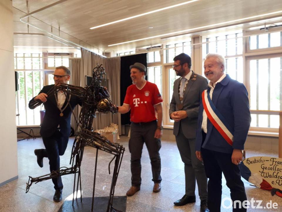 Als Gastgeschenke überreichte Bernd Sommer an Bürgermeister Olivier Thomas und Patrik Pizinger besondere Geschenke aus mundgeblasenem farbigem Lamberts-Glas – Teller mit Gravur, die an das Jubiläum erinnern. Die Marcoussiser hatten eine Arbeit des in der Partnerstadt lebenden Künstlers François Torres ("Toto") mitgebracht – den lebensgroßen laufenden Rugby-Spieler. Er ist eine Nachbildung der Skulptur, die in überdimensionaler Größe auf dem Kreisverkehr in der Partnerstadt am Ortseingang aus Richtung Montlhéry steht. In Waldsassen wird die Statue, die als Symbol für die Freiheit in Europa gilt, künftig im Rathaus-Foyer platziert sein.