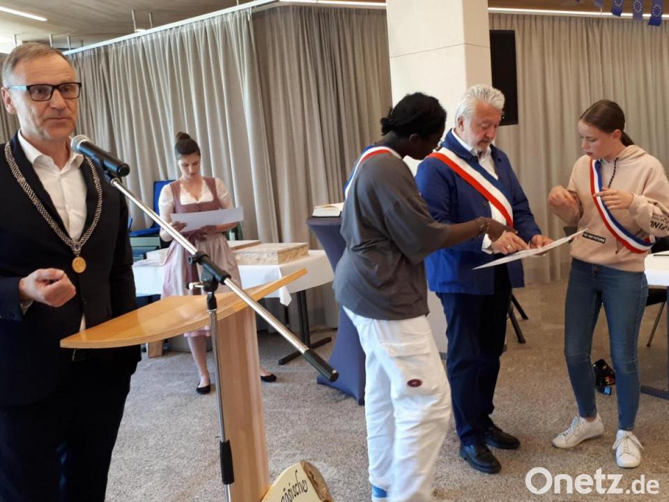 Vertreter der Jugendstadträte, der Partnerschaftsvereine und die beiden Bürgermeister von Marcoussis und Waldsassen erneuerten während der Feierstunde das Partnerschaftsversprechen und unterzeichneten eine entsprechende Urkunde. Die stellvertretende Vorsitzende des Jugendstadtrats Waldsassen, Leonie Lang, verlas die Formel.