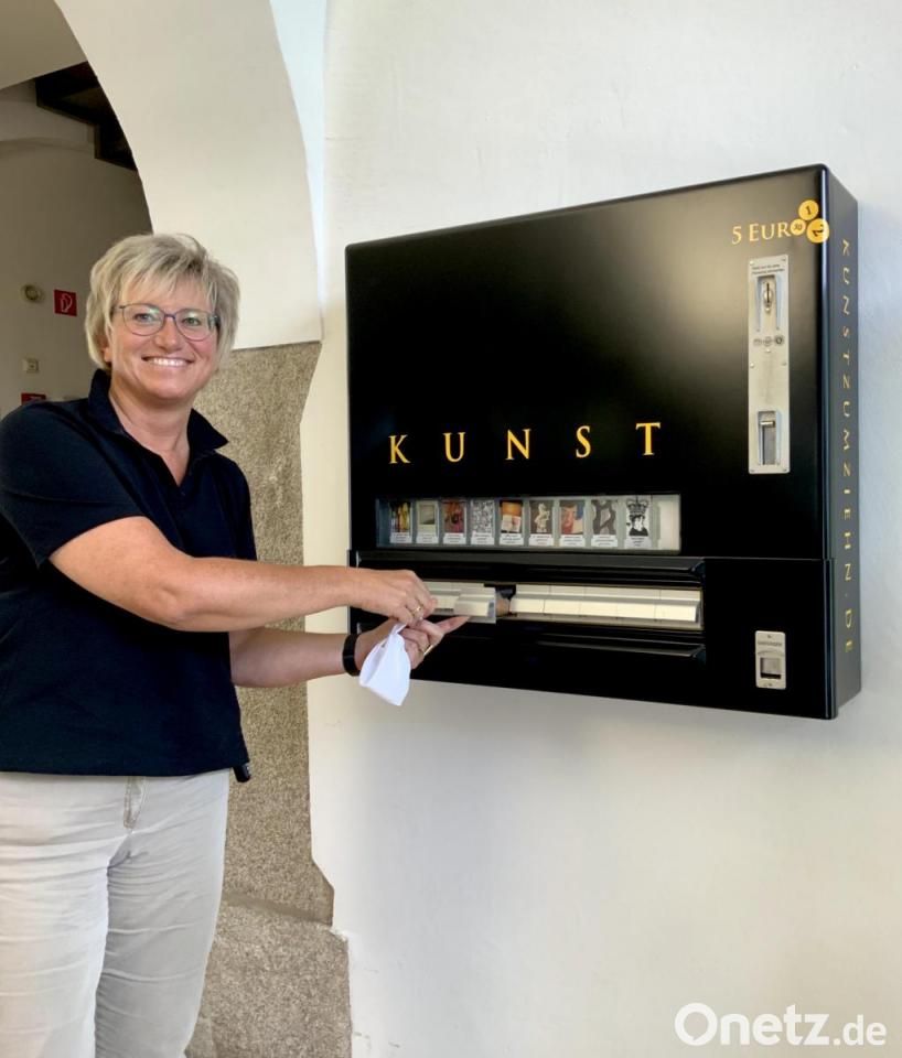 Auch das Design der Schächtelchen übernahmen die Schüler. Nach einer ersten Station am Kepler-Gymnasium hängt er nun seit kurzer Zeit in der Weidener Regionalbibliothek. Im regelmäßigen Wechsel werden darin in zehn Schächten Werke von regionalen und überregionalen Künstlern angeboten – dabei handelt es sich um exklusiv für den Automaten angefertigte Kunstwerke in verschiedenen Techniken in einer limitierten Auflage von jeweils 50 Stück. „Jede Schachtel enthält ein Kunstwerk und ist mit dem Namen des Künstlers, dem Titel der Arbeit und der Nummer der Edition versehen“, so Schmidt. Der Verkaufspreis pro Schachtel liegt bei fünf Euro. Beteiligte Künstler sind unter anderem Ursula Maren Fitz, Marion Mack, Stefan Schadeck und Stefanie Stangl.