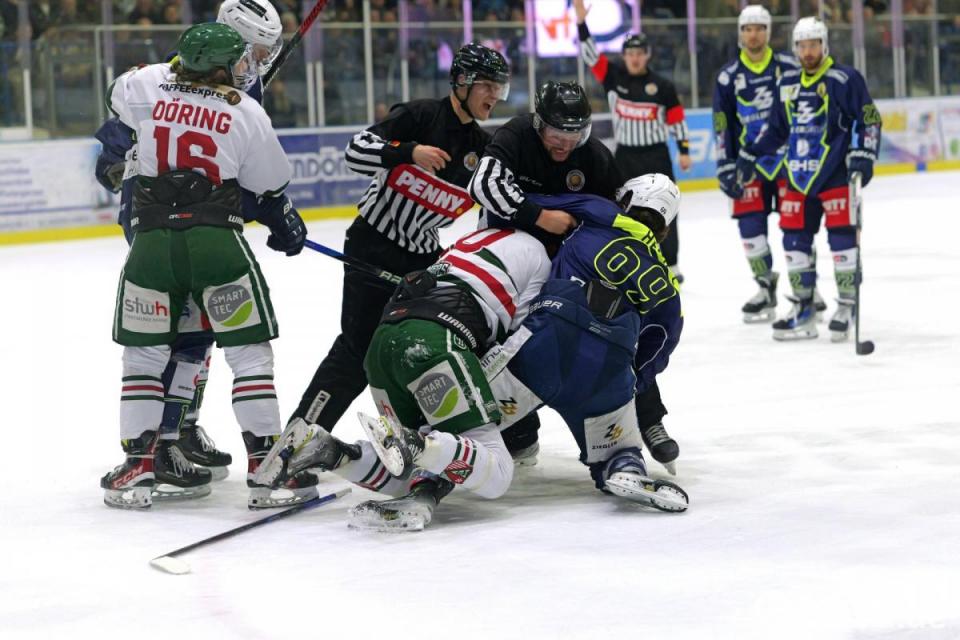 Szenen aus dem dritten Play-off-Finale der Eishockey-Oberliga zwischen den Blue Devils Weiden (blaue Trikots) und den Hannover Scorpions.