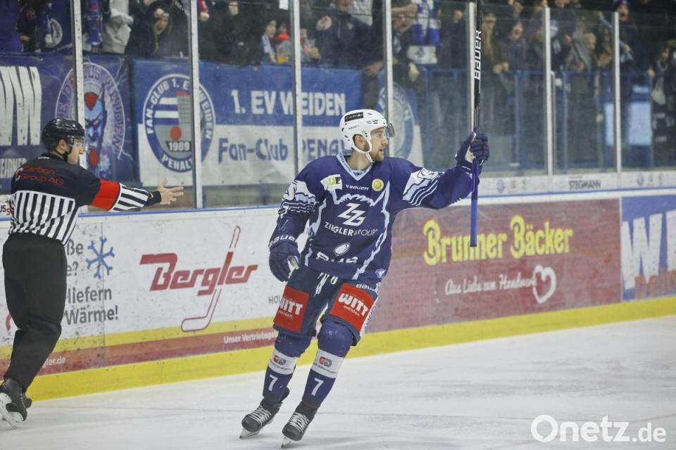 Luca Gläser bejubelt seinen Treffer. Er ist mit den Blue Devils Weiden voll im Soll. Jetzt wartet mit Peiting die nächste Aufgabe im Viertelfinale.