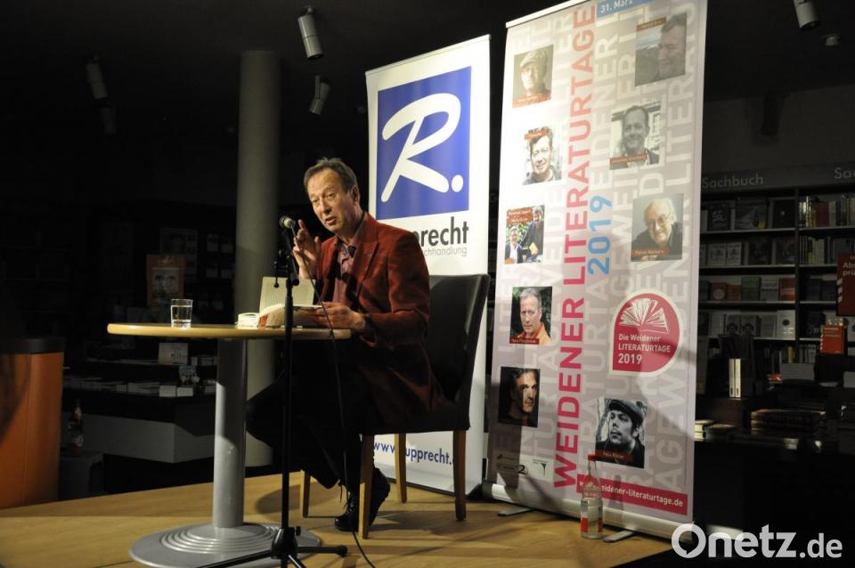 (exb) Wie kann es sein, dass die Nationalsozialisten einerseits feinsinnige Kunst- und Kulturliebhaber waren, andererseits ohne Zögern Todesurteile vollstreckten und skrupellos mordeten? Bei seiner Lesung bei den 33. Weidener Literaturtagen in der Buchhandlung Rupprecht beantwortete Hans Pleschinski diese Frage folgendermaßen: "Die beste humanistische Bildung reicht nicht, wenn nicht Herzensbildung dazu kommt." Pleschinski stellte seinen Roman "Wiesenstein" vor.