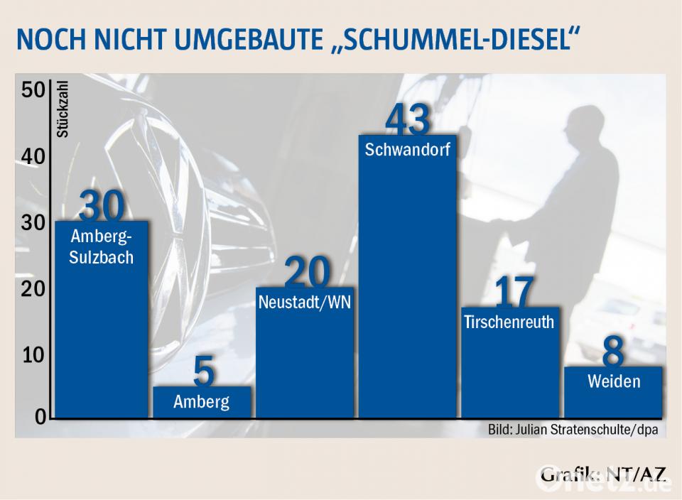 (wüw) Zum Ende der 18-monatigen Umrüstungsfrist für Diesel-Autos mit unzulässiger Abgas-Software sind in der nördlichen und mittleren Oberpfalz 123 Autos noch nicht umgestellt. Den Eigentümern droht nun die Stilllegung des Autos. Die Zahlen stammen von den Zulassungsstellen der Landratsämter Schwandorf, Neustadt/WN, Amberg-Sulzbach und Tirschenreuth sowie der Städte Weiden und Amberg. Deutschlandweit sollen noch rund 15 000 Autos mit der ursprünglich installierten "Schummel-Software" unterwegs sein.