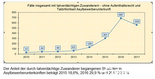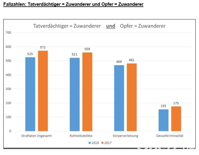 Welche Straftaten begehen Zuwanderer?Auffällig ist der hohe Anteil an Rohheitsdelikten wie Körperverletzung. Sie machen 2017 36,2 Prozent der Zuwanderer-Straftaten aus. Auf alle Straftäter bezogen liegt der Wert bei 17,5 Prozent. 3,3 Prozent der von Zuwanderern begangenen Straftaten waren Sexualdelikte. Bei allen Straftaten macht der Bereich 1,5 Prozent aus. Bei sogenannten Straftaten gegen das Leben, Diebstählen und bei Drogenkriminalität weichen Zuwanderer nicht vom Gesamtschnitt ab.