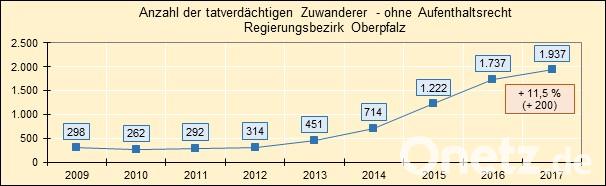 Wie hat sich die Zuwandererkriminalität entwickelt?Die Zahl tatverdächtiger Zuwanderer ist mit der verstärkten Migration gestiegen. 2012 erfasste die Oberpfälzer Polizeistatistik 314 tatverdächtige Zuwanderer. 2015 waren es 1222. Der Wert stieg weiter: auf 1737 im Jahr 2016 und 1937 im Jahr 2017. Um diesen Anstieg zu interpretieren, fehlt wieder eine Zahl zu den Zuwanderern insgesamt. Werte mit den geschilderten Einschränkungen, gibt es u.a. für die Stadt Weiden. Hier stieg die Zahl tatverdächtiger Zuwanderer von 2016 auf 2017 von 170 auf 239 also um fast 40 Prozent. Die Stadt gibt an, dass die Zahl der zur Jahresmitte gemeldeten Zuwanderer von 1016 auf 1052, also um 3 Prozent gestiegen ist.