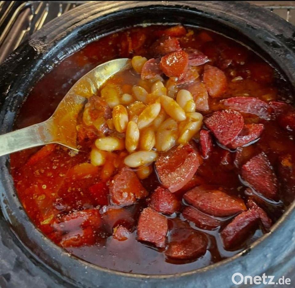 Die Sucuk in einer Pfanne mit Butter anbraten, bis sie heiß ist und ihr volles Aroma entfaltet. Zum Abschluss edelsüßes Paprikapulver unterrühren. Den Tontopf aus dem Ofen holen und die heiße Sucuk-Butter-Mischung über die Bohnen geben. Nicht mehr kochen, nur kurz ziehen lassen.
