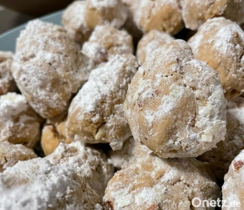 Schließlich die Mandeln unterkneten. Aus dem Teig walnussgroße Stücke formen, rollen und auf Backpapier auf ein Blech legen.