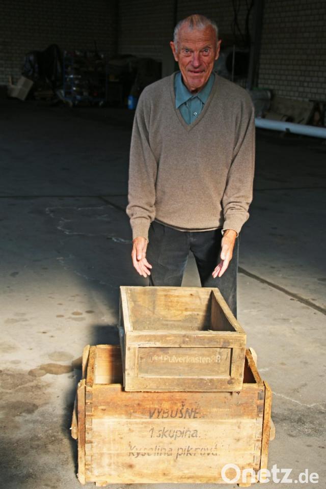 Drei alte Jeeps auf der rechten Seite, ansonsten scheint sie leer zu sein. „Fahren die noch?“, deute ich auf die Militär-Oldtimer. „Jetzt beleidigen Sie mich aber“, erwidert der Bastler spöttisch. Klar, bei einem sei’s schwer, noch die passenden Zündkerzen zu bekommen. „Aber der Udo ist dran“, verweist er auf einen Bekannten, der heute noch mehrmals telefonisch Rapport erstatten sollte. Zeitler aber deutet in eine Ecke, wo eine unscheinbare Holzkiste an der Wand lehnt – mit der Aufschrift „vybušné“, explosiv und „Kyselina pikrová“, Pikrinsäure: „Eine tschechische Munitionskiste“, erklärt er, „die haben uns die Nazis angeliefert, damit wir Munition herstellen.“