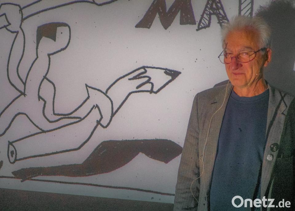 Über Jahre hat der Vorsitzende des Kunstvereins sein Leben mit einer Patchwork-Familie mit spitzer Feder dokumentiert. Und so ein riesiges OEuvre erschaffen, von dem er nur einen winzigen Teil zum besten gibt. Neues Rathaus, das Gymnasium, der Flutkanal - mit den "Lückenknüllerkids" hat Herzer einen Ort erschaffen, der stark an Weiden erinnert. Reiner Zufall aber: Schließlich habe sein Planet einen direkten Zugang zur Ostsee - samt Hafen, so Herzer. Zunächst gibt es eine Führung durch "Everywen", auf der das Publikum eine Menge Orte und Protagonisten kennenlernt. Da ist zunächst der Erzähler Omar Sheriff, der sich ohne Not eine Papiertüte über den Kopf gestülpt hat. Dann gibt es die "Lückenknüllerkids" der "Ältern Vulkana" und "Woo-Fi": die Mädchen "No-Nein" und "Hier-Wohne-Ich" sowie die Jungs Melo und "Hier-Soll-Es-Schön-Sein". Diese Hauptfiguren laufen durch eine skurril skizzierte Welt, belebt von "Pröppeln", den Bürgern von "Everywen". Dann gibt es da noch die Schlange Liberty, galoppierende, weit vom Stamm gefallene Äpfel, oder die alles fest im Griff habende öffentliche Hand.