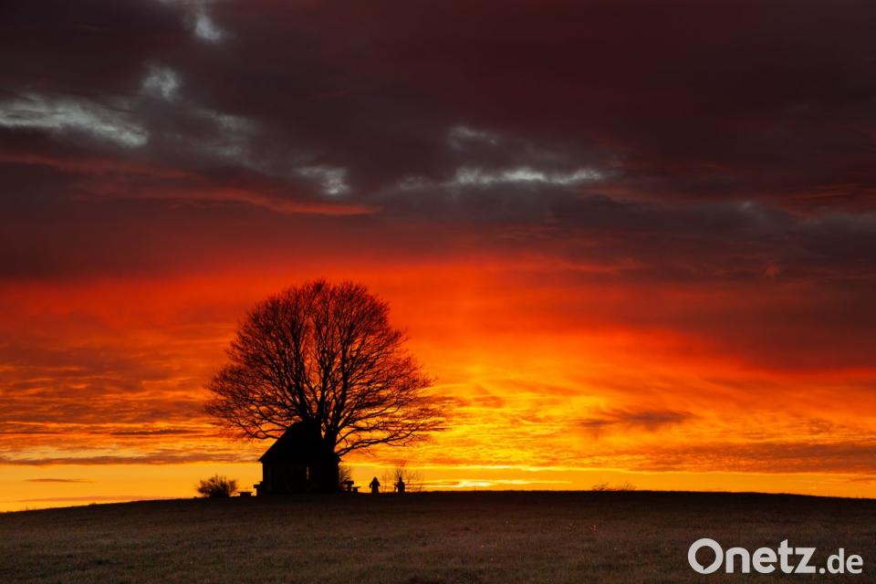 Brennender Sonnenuntergang über der Kapelle Muglhof, eingefangen von Herta Schell - bei böhmischem, eiskaltem Ostwind.