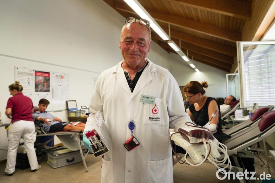 In seiner rechten Armbeuge steckt nun eine Kanüle. Durch den Schlauch rinnt sein Blut in einen Beutel neben der Liege. 159 Milliliter zeigt die Waage. Nun fischt der Weidener sein Handy aus der Hosentasche, knipst ein Foto vom Arm. 172 Milliliter.