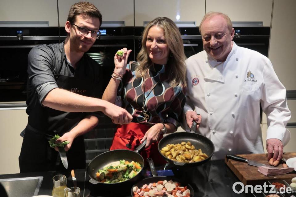 Feinschmecker unter sich: Die beiden Kabarettisten Martin Frank und Monika Gruber mit Sternekoch Alfons Schuhbeck.
