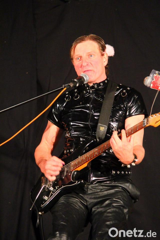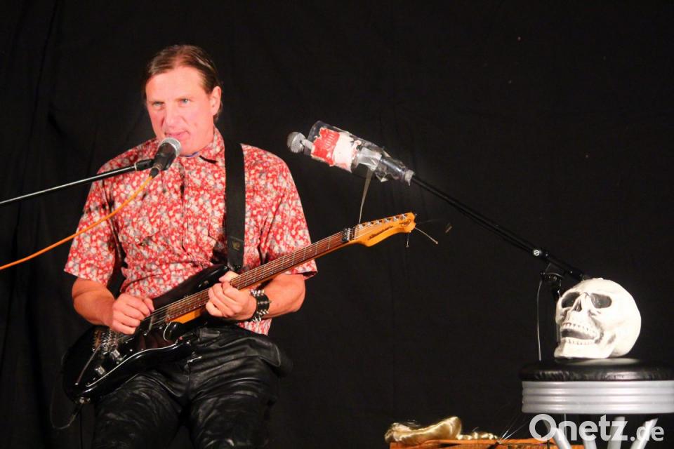 "Rockmusik ist mein Leben", behauptet der Künstler auf der Bühne. Auch optisch entsprechen er und die Bühnenausstattung dem Klischee - zumindest teilweise: Eng ansitzende Hose aus schwarzem Leder, Pomade in den Haaren, ein Rocker-Nietenband am Arm. Auf dem Hocker nebem ihm liegt ein Totenkopf-Schädel. Ein schrilles Blümchenhemd und weiße Socken vervollständigen sein Outfit, das Plektrum holt er aus einem Kinder-Brustbeutel hervor. Das Mikrofon schiebt er - ganz rockermäßig - mit der Nase von sich weg.