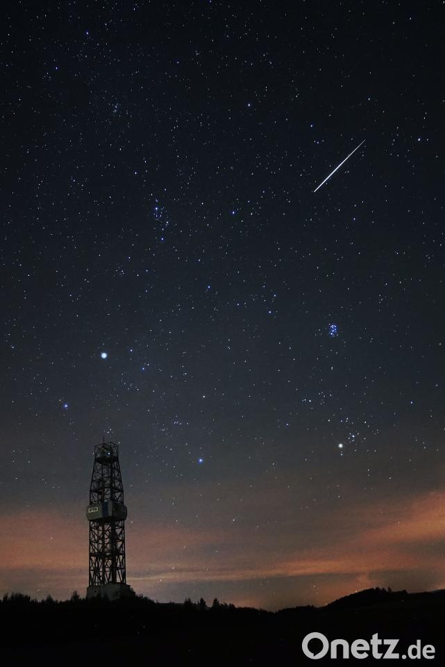 Was für ein Moment: Unser Leser Wilhelm Daubner hat diese Sternschnuppe in der Nacht von Samstag auf Sonntag über dem Bohrturm der KTB bei Windischeschenbach (Kreis Neustadt/WN) festgehalten. Der Strom der Perseiden erreichte am Wochenende seinen Höhepunkt, das Maximum in der Nacht zum Montag. Fachleute rechneten am Wochenende mit bis zu 100 Meteoren (Sternschnuppen) pro Stunde. Ein theoretischer Wert, sagt der Vorsitzende der Sternfreunde, Sven Melchert. "Ein einzelner Beobachter sieht vielleicht 20 bis 30 pro Stunde, denn er kann nur einen Teil des Himmels überblicken."