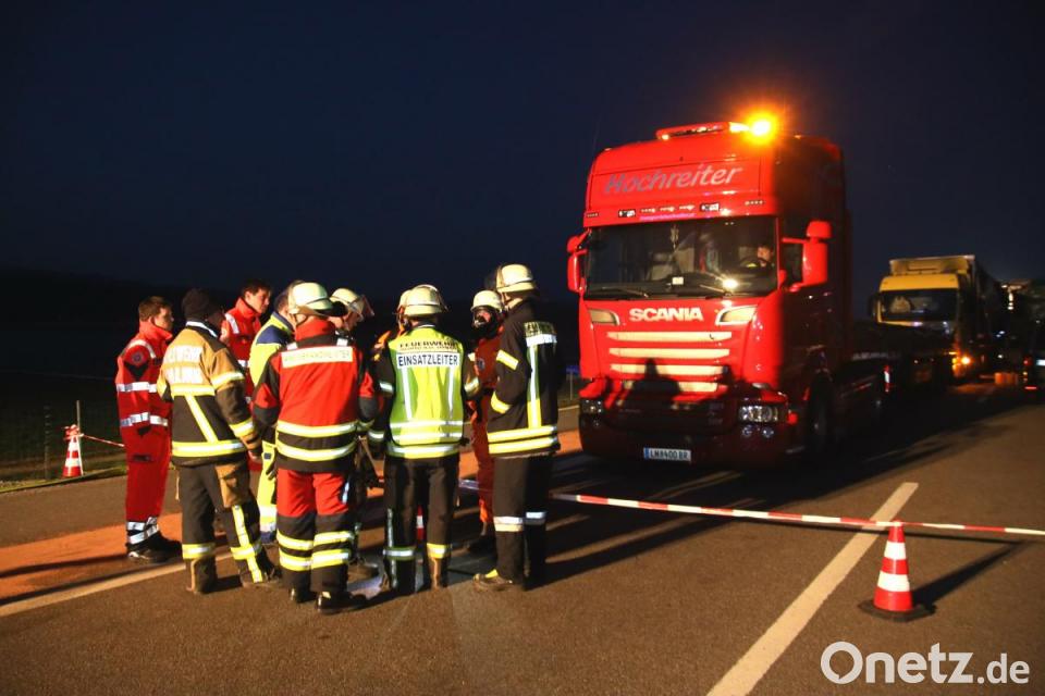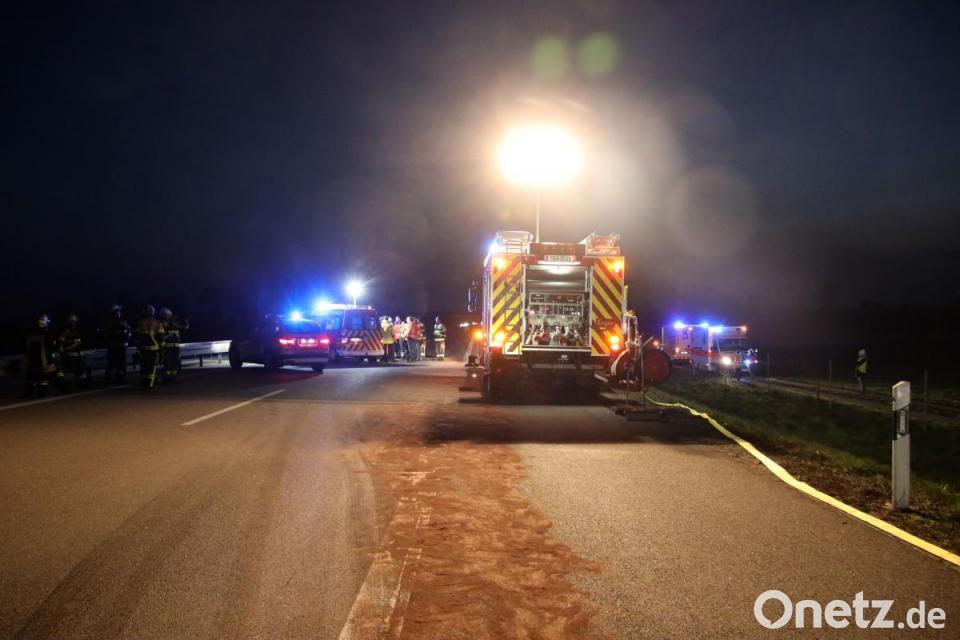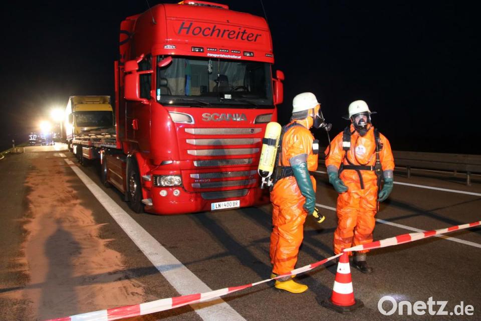 Insgesamt wurden bei dem Unfall fünf Personen leicht bis mittelschwer verletzt, sagte der Einsatzleiter der Verkehrspolizei Christian Eichenseer. Die Feuerwehren errichteten eine Sperrzone an der Unfallstelle, um den Risiko von austretendem Gefahrstoff vorzubeugen. Der Auffahrende Lkw hatte nicht nur ein Gefahrgutschild am Laster, sondern innen an den Kisten auch noch den Hinweis auf zerbrechliche Ware. Eichenseer erklärte: "Das Problem ist, dass die Fässer beschädigt sind". Nur mit Chemikalienschutzanzügen und unter Atemschutz näherten sich die Feuerwehreinsatzkräfte dem Lkw. Noch in der Nacht rückten Gefahrgut-Spezialisten der Polizei an. Das THW leuchtete die Unfallstelle aus. Dann gab es Entwarnung: Die Behälter waren zwar beschädigt, jedoch war kein Gefahrenstoff ausgetreten.