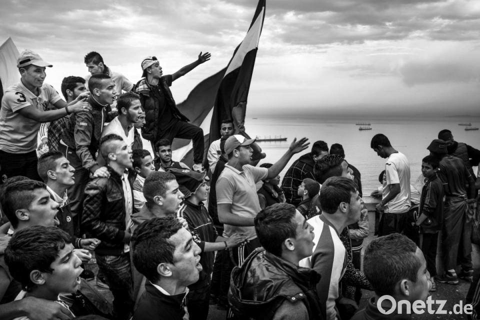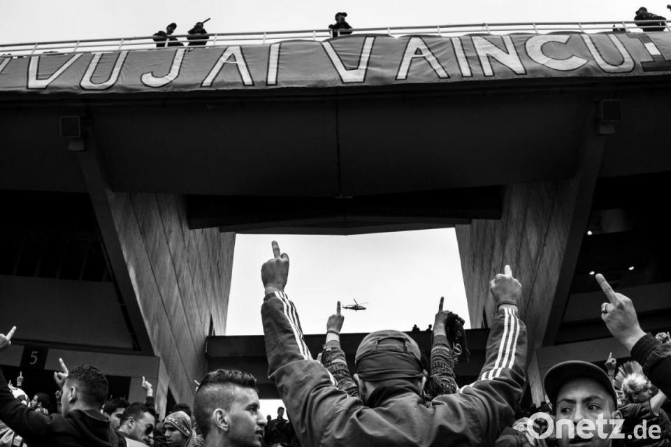 WORLD PRESS PHOTO STORY OF THE YEAR: Fußballfans versammeln sich auf der Straße und singen während eines Spiels, das aufgrund von Gewalt hinter verschlossenen Toren stattfindet. Die Serie «Kho, die Entstehung einer Revolte» über die Unruhen in Algerien des französischen Fotografen Romain Laurendeau ist "Beste World Press Photo-Story des Jahres.