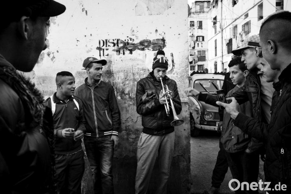 Algerien, Alger: WORLD PRESS PHOTO STORY OF THE YEAR: Ein junger Mann hat Publikum, während er im überfüllten Viertel "Climat de France" in Bab el-Oued mit einer Trompete experimentiert. Niemand weiß, wie man das Instrument spielt, aber es löst eine weit verbreitete Begeisterung aus. Die Serie «Kho, die Entstehung einer Revolte» über die Unruhen in Algerien des französischen Fotografen Romain Laurendeau ist "Beste World Press Photo-Story des Jahres".