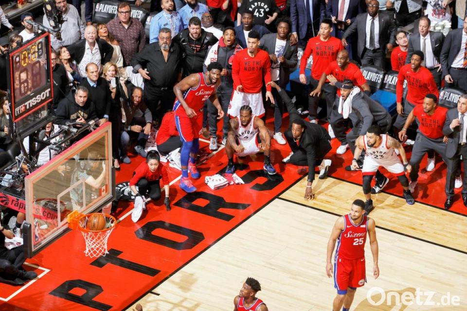 World Press Photo 2020, Kategorie "SPORTS - FIRST PRIZE, SINGLES": Kawhi Leonard (in der Hocke, Mitte) von den Toronto Raptors sieht zu, wie sein Wurf ins Netz geht, während er in der Scotiabank Arena gegen die Philadelphia 76ers im Spiel 7 der Halbfinalspiele der Eastern Conference der NBA-Playoffs 2019 spielt