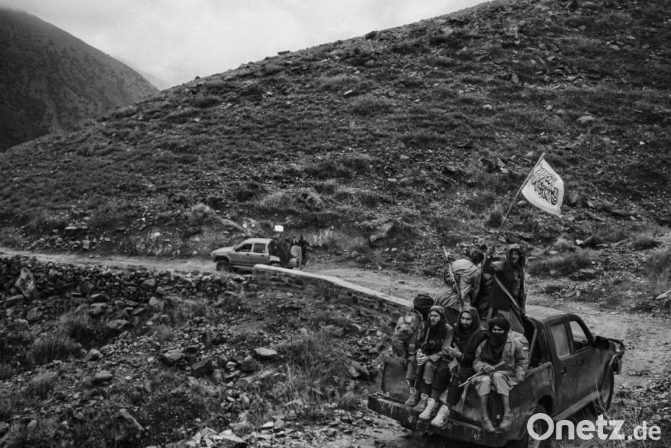 Taliban-Kämpfer fahren mit ihrer Flagge in einem Gebiet in, das zuvor von der Gruppe Islamischer Staat kontrolliert wurde.